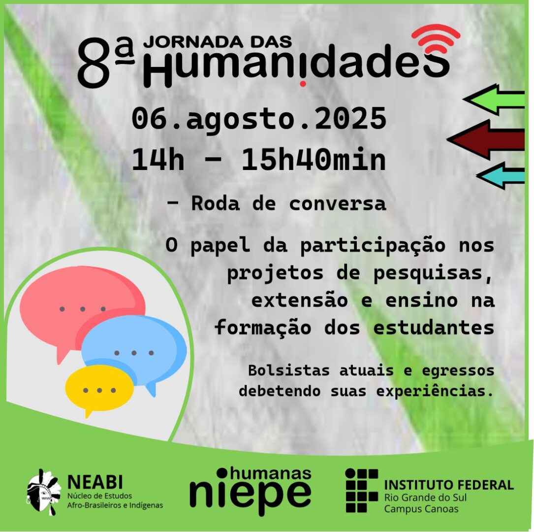 Interessados em participar das atividades propostas pela Jornada de Humanidades podem entrar em contato pelo e-mail niepe.humanas@canoas.ifrs.edu.br.