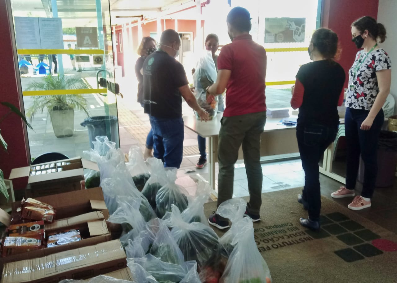 As sacolas de alimentos carregam produtos provenientes da agricultura familiar agroecológica. Cada kit contém feijão, arroz, farinha, leite, pão, vegetais, frutas, café e barras de cereais. Os dois últimos itens não foram adquiridos especificamente para as sacolas de doação, mas estavam no estoque de mantimentos da merenda escolar. Os kits respeitam as diversidades culturais e alimentares das produções locais conforme cada região do Estado onde o IFRS está situado. Respeitando a sazonalidade, são no mínimo 30% de orgânicos e incluem as Plantas Alimentícias Não Convencionais (PANC) in natura ou enquanto ingrediente de produtos panificados.