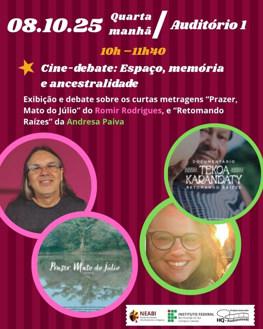 No segundo dia de mostras, aconteceram duas sessões em parceria com o Núcleo de Estudos Afro-brasileiros e Indígenas (Neabi). A primeira, o cine-debate intitulado Espaço, memória e ancestralidade, com a exposição dos documentários em curta-metragem Prazer, Mato do Júlio, de Romir Rodrigues, e Retomando Raízes, de Andresa Paiva. O primeiro apresenta a última grande área verde da região metropolitana, localizada no município de Cachoeirinha, conhecida por Mato do Júlio, a partir das várias memórias que habitam aquele espaço. Faz parte dessas memórias a comunidade índigena Mbya-Guarani, que ali estabeleceu um movimento de retomada da área. É exatamente esta retomada e a compreensão de mundo dos Mbya-Guarani que é apresentado no segundo curta. São, portanto, produções que se completam.