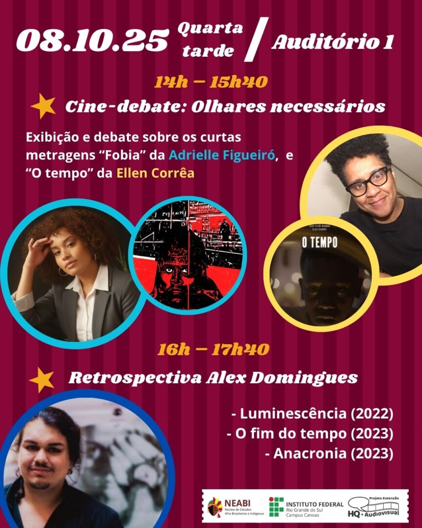 A segunda sessão conjunta com o Neabi foi o cine-debate Olhares necessários, apresentando os curtas Fobia, de Adrielle Figueiró, e O tempo, de Ellen Corrêa. Ambas são realizadoras negras e apresentam em seus filmes abordagens de conteúdo e estéticas que, de formas distintas, dialogam com a complexidade das subjetividades marcadas pelas questões raciais e os processos que envolvem a construção da identidade negra na nossa sociedade.