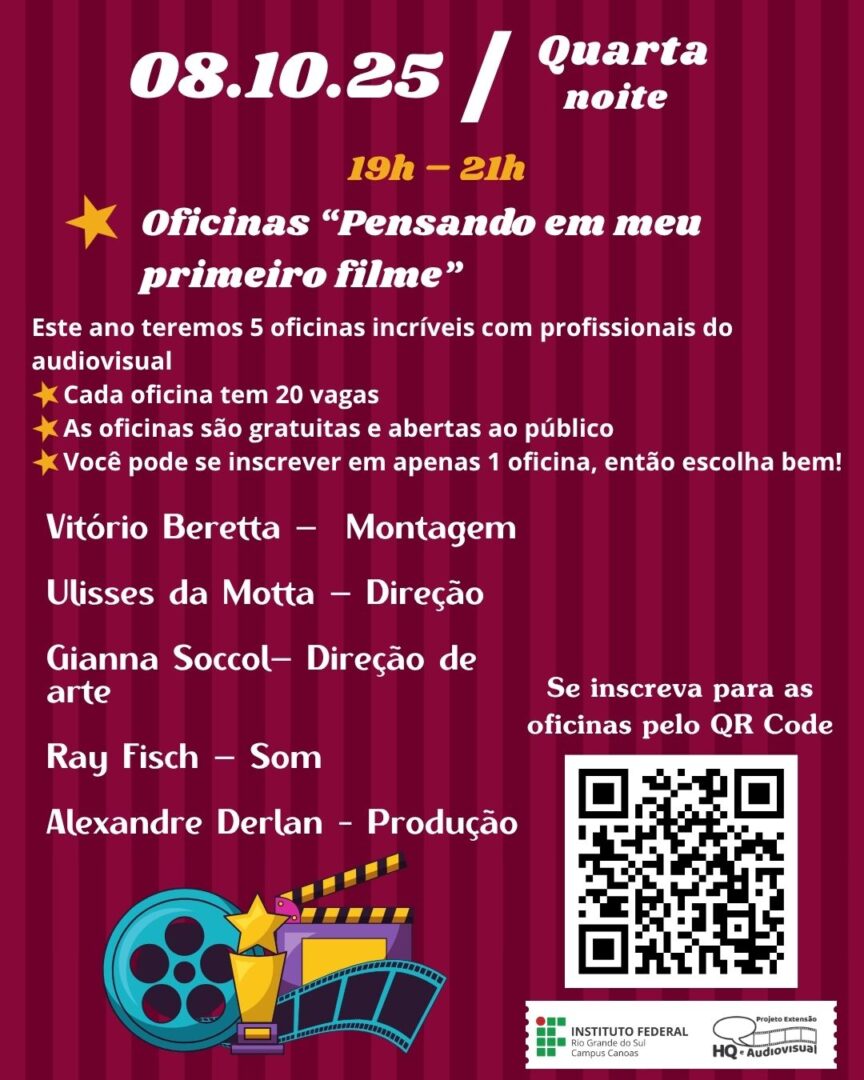 Fechando o segundo dia da Mostra, teremos a realização das oficinas Pensando em meu primeiro filme. Serão oferecidas cinco oficinas por profissionais de diferentes áreas da produção audiovisual. As oficinas oferecidas foram: Montagem, com Vitório Beretta; Direção, com Ulisses da Motta; Direção de arte, com Gianna Soccol; Som, com Ray Fisch; e Produção, com Alexandre Derlan. As oficinas foram abertas ao público.