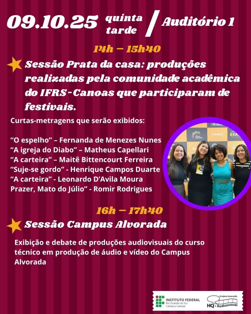 Na tarde do dia 09/10, encerrando a 4ª edição da Mostra, tivemos duas ações. A primeira, a Sessão Prata da casa, com produções realizadas pela comunidade acadêmica do Campus Canoas que participaram de festivais anteriores. Foram apresentados os seguintes curtas-metragens: Prazer, Mato do Júlio, de Romir Rodrigues; O espelho, de Fernanda de Menezes Nunes; Suje-se gordo, de Henrique Campos Duarte; A carteira, de Maitê Bittencourt Ferreira; A igreja do Diabo, de Matheus Capellari; e A carteira, de Leonardo D’Avila Moura.