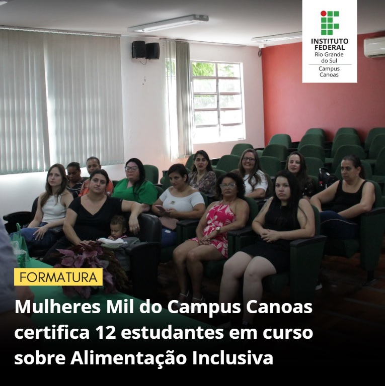 Na tarde de 19 de dezembro de 2025 foram certificadas no Campus Canoas do IFRS 12 mulheres no curso Alimentação Inclusiva: formação inicial de manipuladoras de alimentos para pessoas com necessidades alimentares específicas. A certificação é vinculada ao Programa Mulheres Mil. O curso foi realizado no Campus Canoas, no segundo semestre de 2025, de 8 de outubro a 18 de dezembro, com carga-horária de 160 horas.