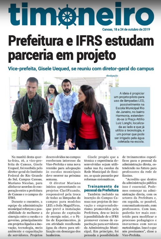 Acordos de cooperação entre a prefeitura de Canoas e o campus do IFRS tiveram novo impulso na manhã desta quarta-feira, dia 16, durante a visita da vice-prefeita, Gisele Uequed, à instituição. Recebida pelo diretor-geral do Campus Canoas, Mariano Nicolao, a equipe da administração municipal reforçou a possibilidade de melhorar a sinergia entre a escola e o governo, principalmente em projetos ligados a inovação, tecnologia, meio ambiente e capacitação de servidores. Projetos desenvolvidos no campus receberam interesse da vice-prefeita e uma nova reunião para adequação às escolas municipais deve ocorrer na próxima semana.