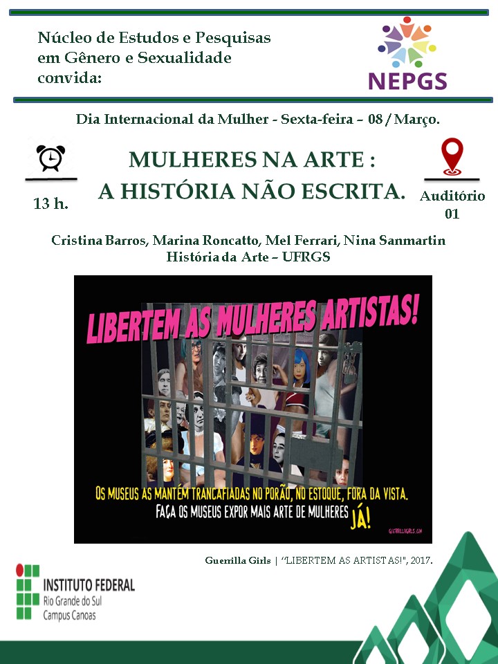 Nesta sexta-feira, dia 8 de março, data em que se celebra o Dia Internacional da Mulher, Núcleo de Estudos e Pesquisas em Gênero e Sexualidade (Nepgs) promoveu uma palestra intitulada “Mulheres na arte: a história não escrita”. A ação ocorreu às 13h, no Auditório 1. As ministrantes foram as pesquisadoras Cristina Barros, Marina Roncatto, Mel Ferrari e Nina Sanmartin, que atuam na Universidade Federal do Rio Grande do Sul (UFRGS).