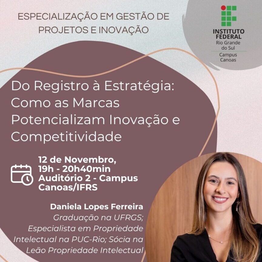 Nesta quarta-feira, dia 12 de novembro, das 19h às 20h40min, ocorre a palestra “Do Registro à Estratégia: como as marcas potencializam inovação e competividade”. A palestrante será a advogada Daniela Lopes Ferreira, especialista em Propriedade Intelectual pela PUC-Rio e Sócia da Leão Propriedade Intelectual. O evento é organizado pela Especialização em Gestão de Projetos e Inovação do Campus Canoas do Instituto Federal do Rio Grande do Sul (IFRS).
