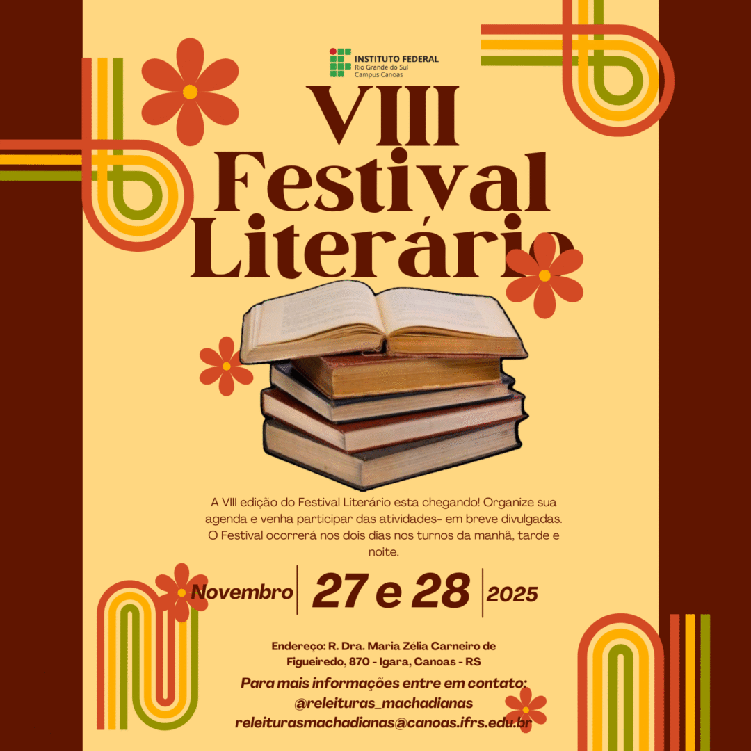 Toda a comunidade está convidada para participar do VIII Festival Literário do Campus Canoas do IFRS, que ocorrerá nos dias 27 e 28 de novembro de 2025. Serão dois dias dedicados à celebração da leitura e da escrita, com uma programação que inclui palestras, oficinas, rodas de conversa, lançamentos de livros e apresentações culturais.