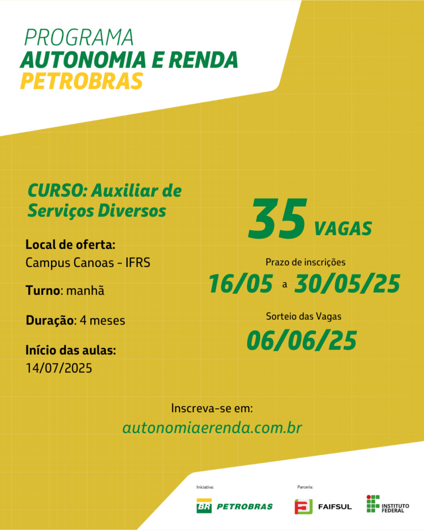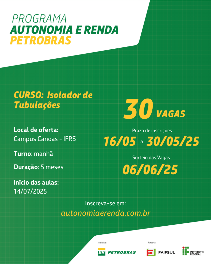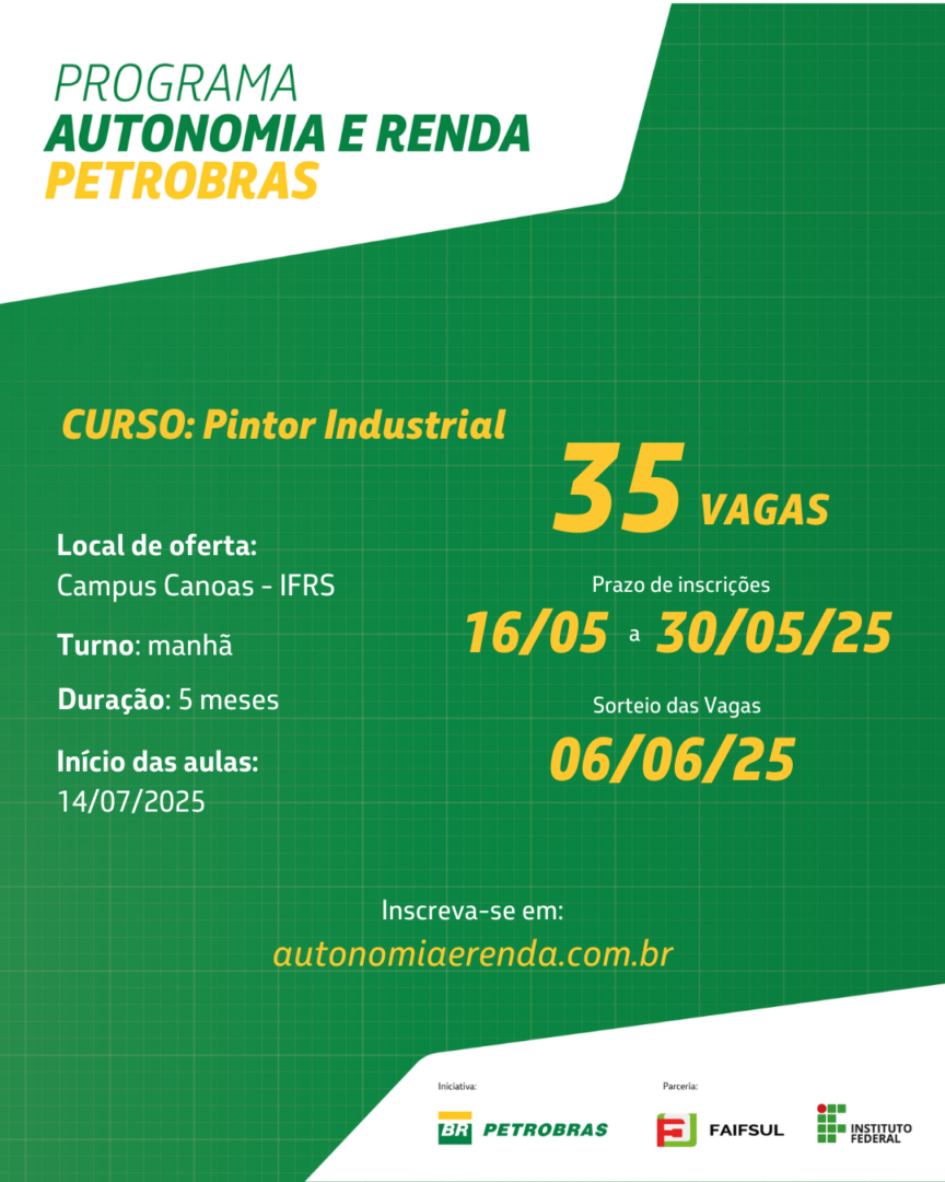O Programa Autonomia e Renda Petrobras lançou, nesta quinta-feira (15/05), o Edital nº 35/2025, com vagas abertas para três cursos gratuitos em Canoas, realizados em parceria entre a Petrobras e o Instituto Federal de Educação, Ciência e Tecnologia do Rio Grande do Sul (IFRS). As turmas são de “Auxiliar de Serviços Diversos”, “Pintor Industrial” e “Isolador de Tubulações” e somam cem vagas. As inscrições podem ser realizadas de 16 a 30 de maio, por formulário eletrônico.