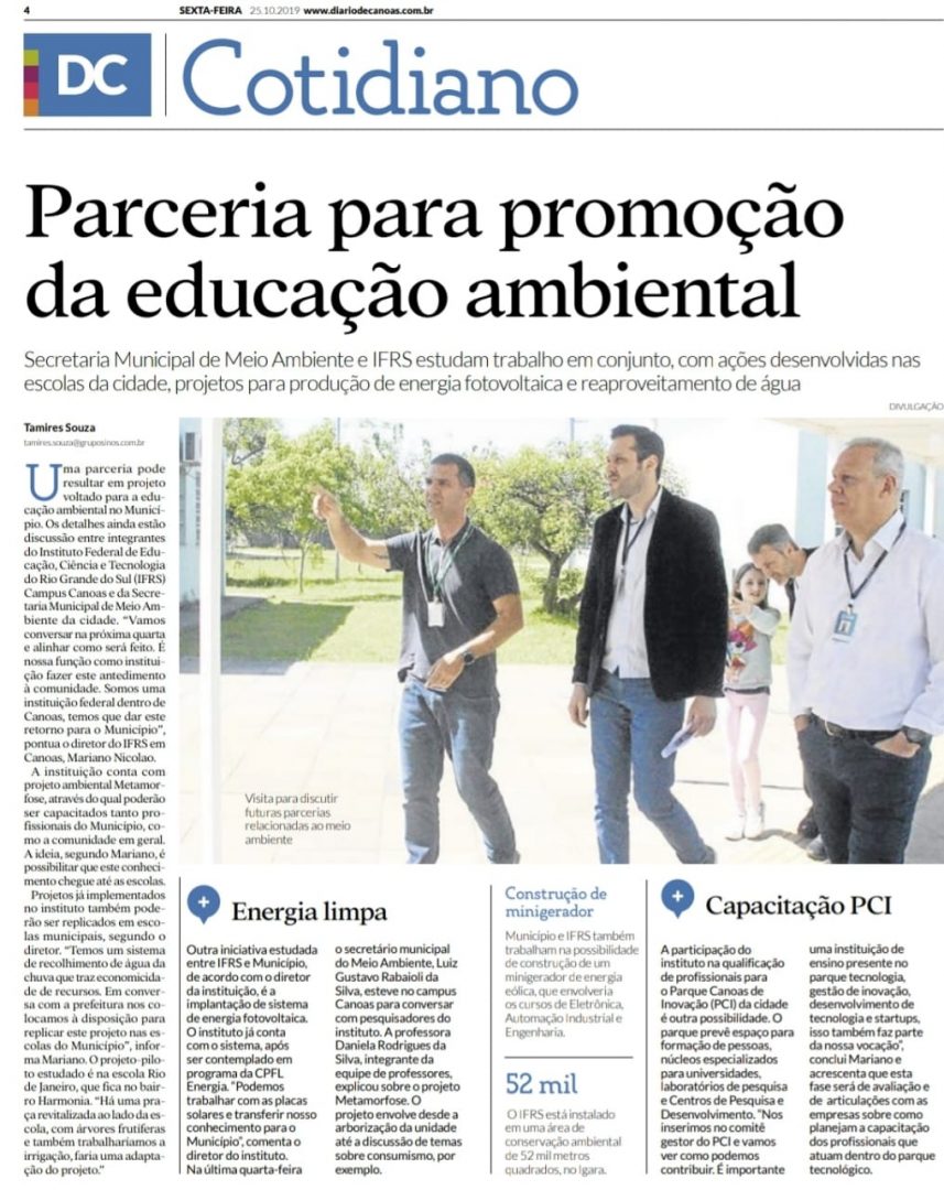 Parcerias envolvendo projetos de Ensino, Pesquisa e Extensão sobre questão ambiental começaram a ser tratadas entre a prefeitura de Canoas e o campus do Instituto Federal de Educação, Ciência e Tecnologia do Rio Grande do Sul (IFRS). Na manhã desta quarta-feira, dia 23, o secretário municipal do Meio Ambiente, Luiz Gustavo Rabaioli da Silva, esteve na instituição para conversar com pesquisadores do instituto. A intenção, além de replicar em órgãos da prefeitura alguns projetos já instalados no campus, é ampliar a parceria entre as duas instituições públicas com capacitação de servidores municipais e desenvolvimento de pesquisas em busca de soluções para questões práticas e reais demandadas pela cidade.
