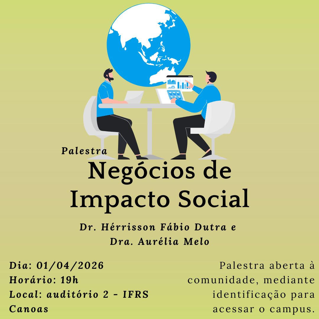 ⇔ 01 de abril, das 19h às 22h: Negócios de Impacto Social, ministrada por Hérrisson Fábio Dutra e Aurélia Mello;