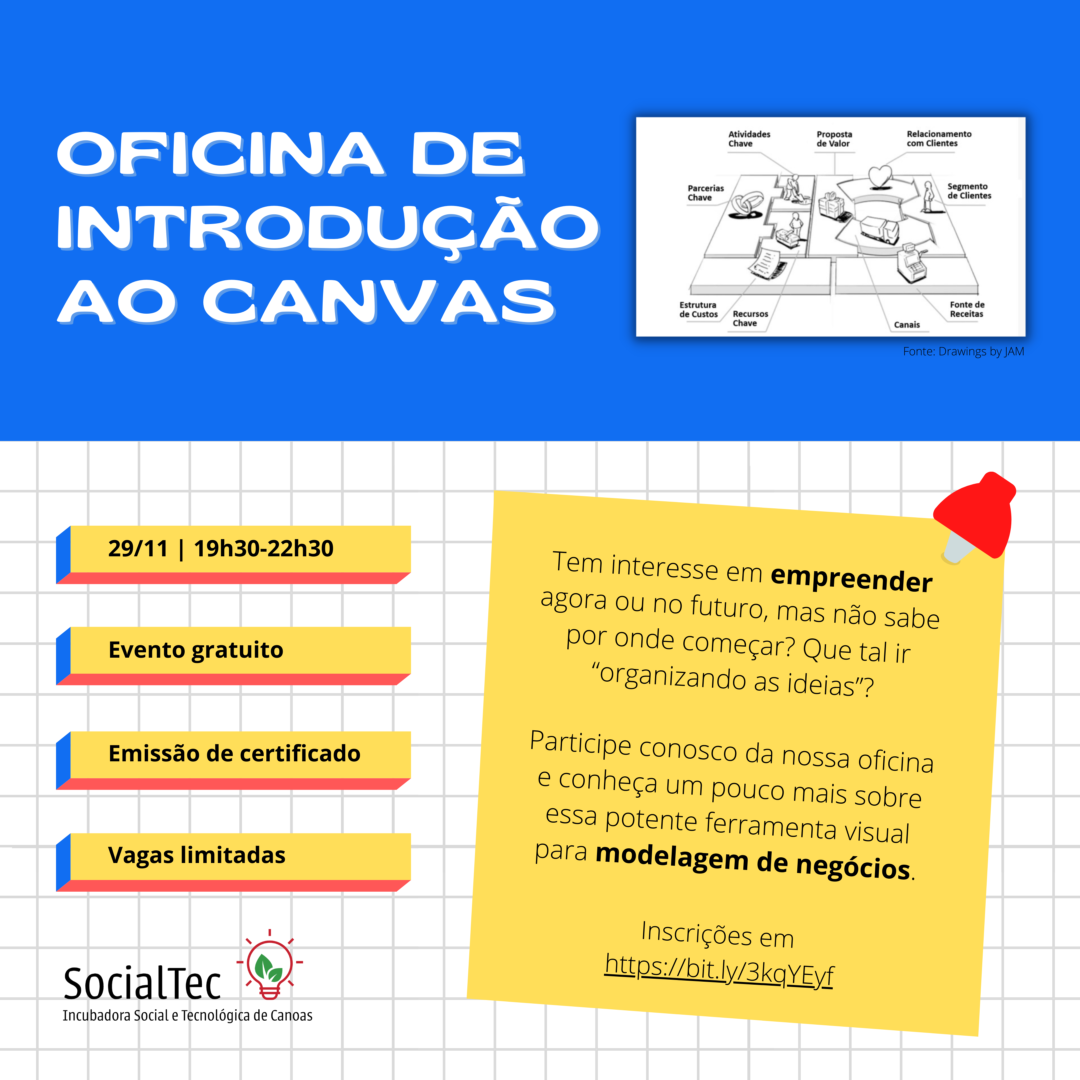 Outra atividade organizada pela SocialTec será a Oficina de Introdução ao Canvas, que acontece na segunda-feira, 29 de novembro, às 19h30min. O evento ocorre via Google Meet e para participar, é necessário realizar inscrição prévia pelo link https://forms.gle/odj9KHYALq6Py9Yi9.