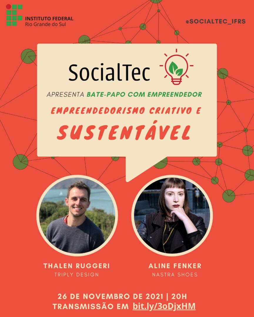 A reunião on-line inicia às 20h, com a palestra Empreendedorismo Criativo e Sustentável, tendo Aline Fenker e Thalen Ruggeri como ministrantes. O evento será transmitido pelo canal do YouTube da SocialTec: https://www.youtube.com/watch?v=YOxrzi9aclU