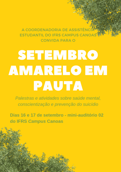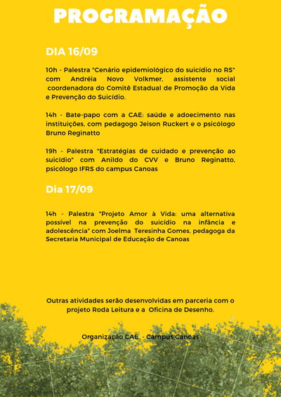 - 19h – Palestra “Estratégias de cuidado e prevenção ao suicídio” com Anildo do CVV e Bruno Reginatto, psicólogo do Campus Canoas do IFRS