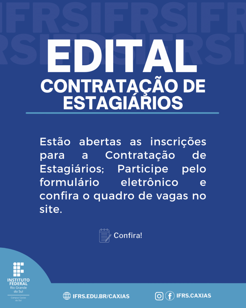 O Instituto Federal do Rio Grande do Sul – Campus Caxias do Sul está com inscrições abertas para o Edital nº 07/2026 – Contratação de Estagiários. As inscrições devem ser realizadas de 20 de fevereiro a 05 de março de 2026, por meio de formulário eletrônico disponível online. No quadro de vagas estão disponíveis todas as informações sobre requisitos, carga horária…