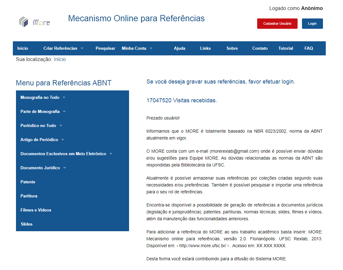 MORE: Mecanismo online para referências, versão 2.0. Florianópolis: UFSC Rexlab, 2013. Disponível em: ‹ http://www.more.ufsc.br/ › . Acesso em: XX XXX XXXX.