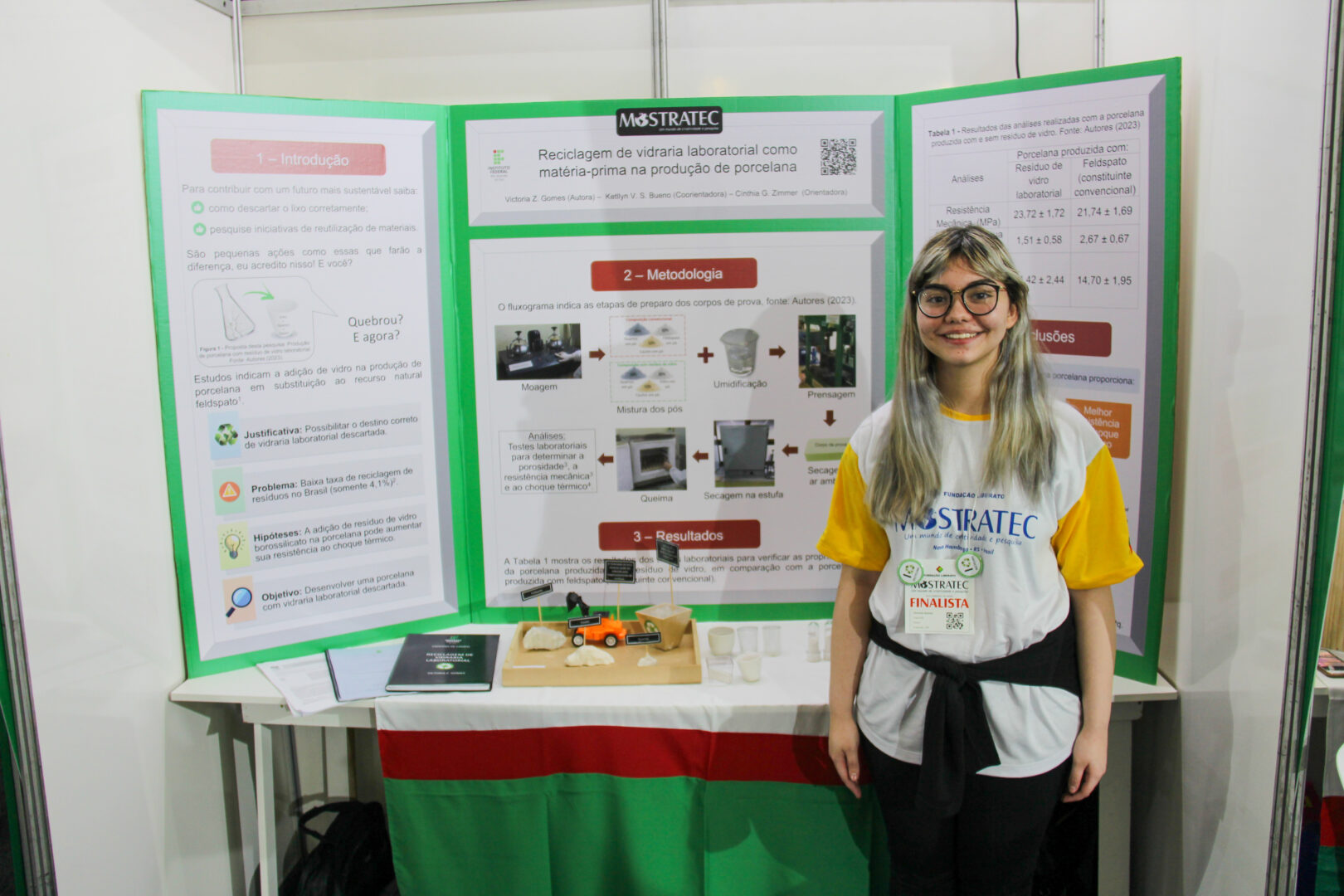 Ela destaca ainda a oportunidade de encontrar colegas de outros campi e conhecer o trabalho desenvolvido por eles. “Tenho muita gratidão pela minha orientadora e pelo IF por todo suporte dado.” O projeto de Victória chama-se “Reciclagem de vidro laboratorial como matéria-prima na produção de porcelana” e é orientado pela professora Cínthia Gabriely Zimmer.