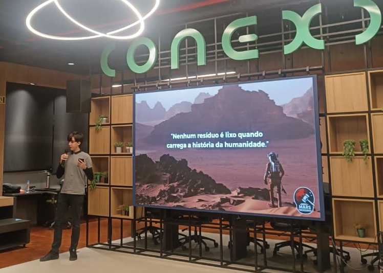 Apresentação do projeto da equipe Mars Treasures, que propõe converter os resíduos inorgânicos de missões tripuladas a Marte em itens colecionáveis certificados, utilizando os recursos obtidos para financiar o retorno seguro desses materiais à Terra.
