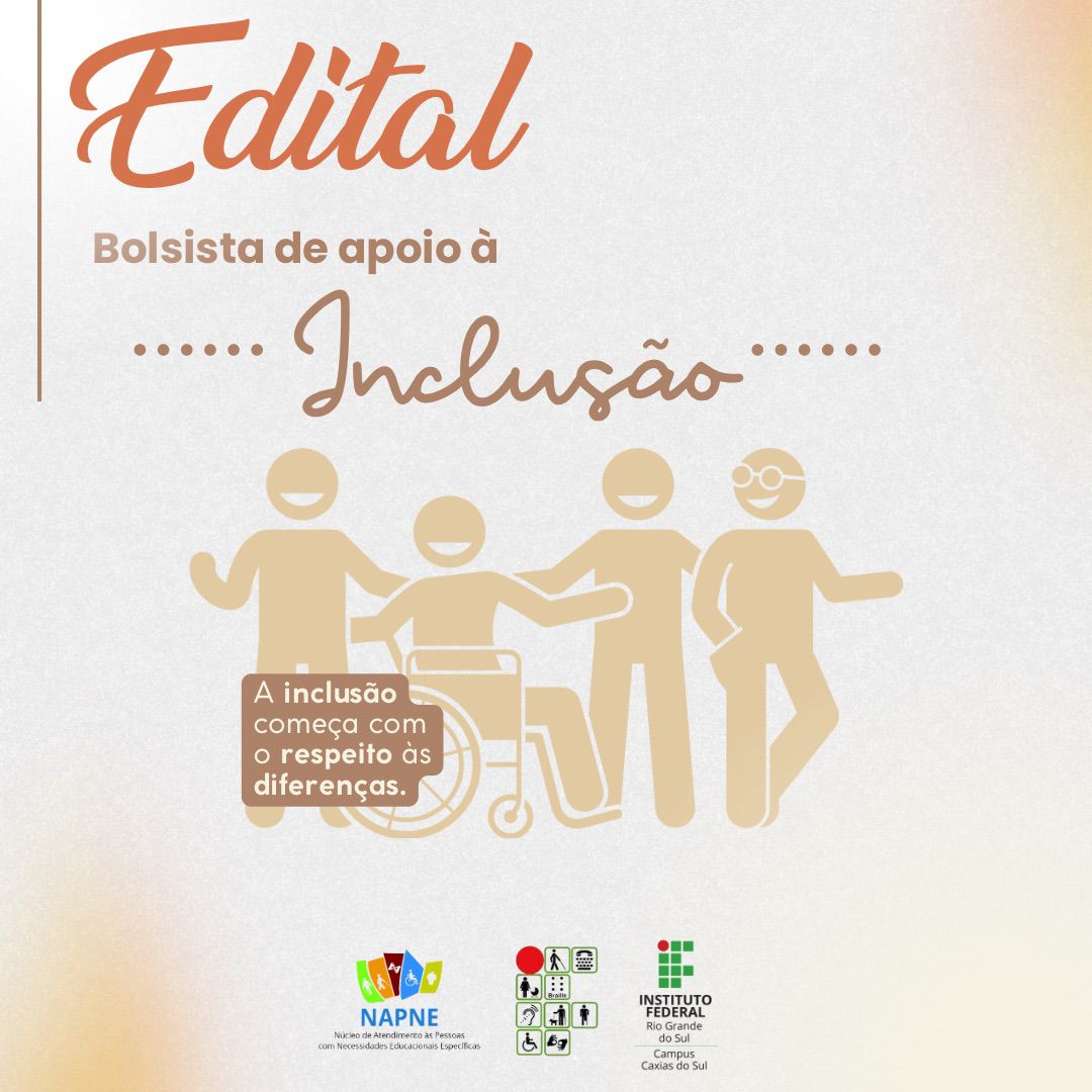 O Instituto Federal do Rio Grande do Sul (IFRS), Campus Caxias do Sul publicou o Edital nº 02, que trata do processo seletivo para a contratação de bolsistas de apoio à inclusão. A iniciativa é vinculada ao Núcleo de Atendimento às Pessoas com Necessidades Educacionais Específicas (NAPNE) e tem como objetivo fortalecer as ações de acessibilidade e inclusão no ambiente acadêmico.