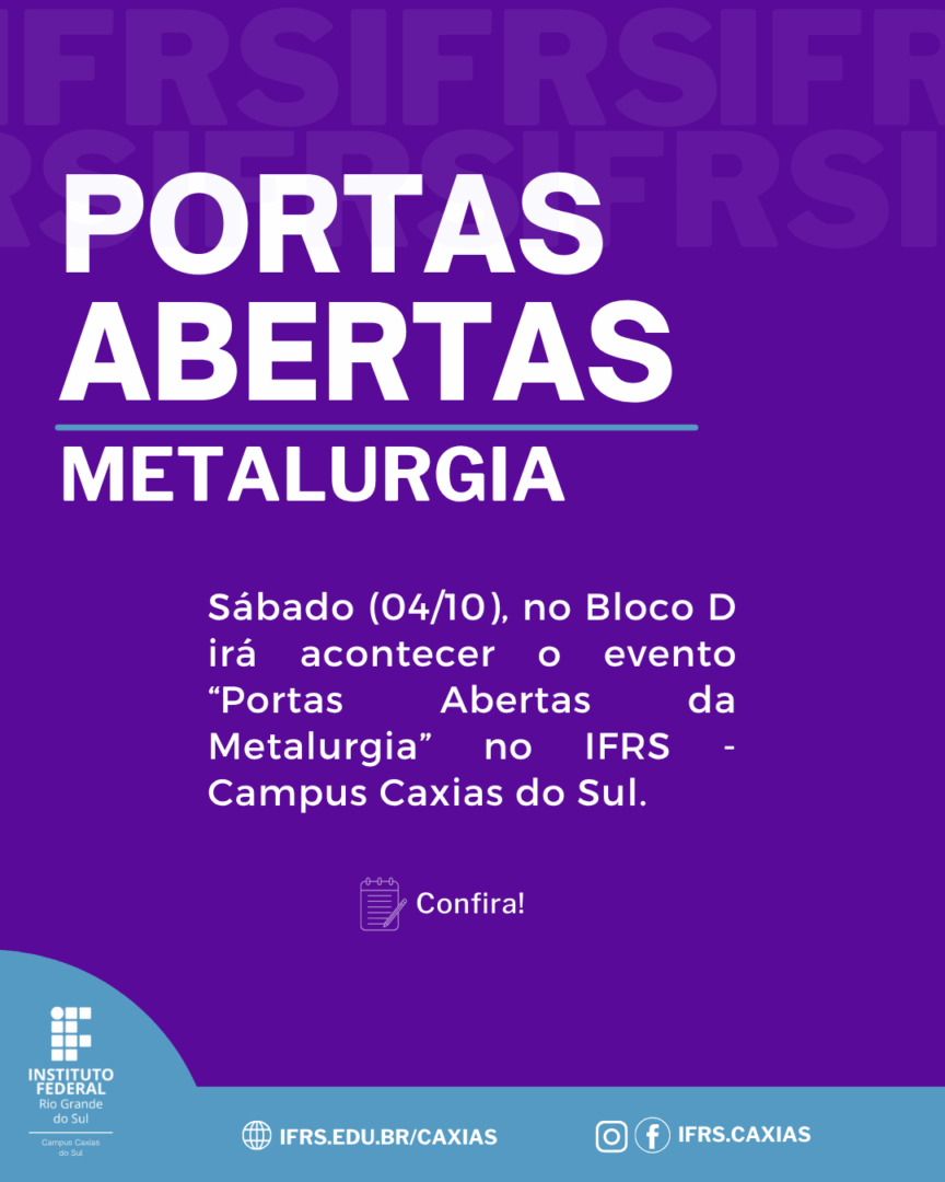 O IFRS – Campus Caxias do Sul convida a comunidade para participar do Portas Abertas da Engenharia Metalúrgica, no bloco D, na manhã de Sábado (04/10). O evento é uma oportunidade para conhecer a infraestrutura do campus, conversar com professores e alunos, e explorar as diversas áreas do curso de Engenharia Metalúrgica.