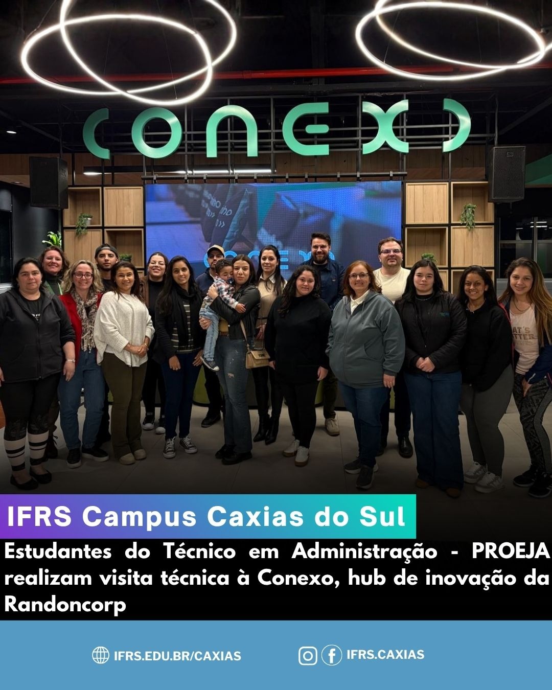 Na noite de 10 de novembro de 2025, as turmas do Curso Técnico em Administração – PROEJA realizaram uma visita técnica à Conexo, o hub de inovação da Randoncorp, que oferece serviços como coworking, programas de inovação e amplas oportunidades de networking.