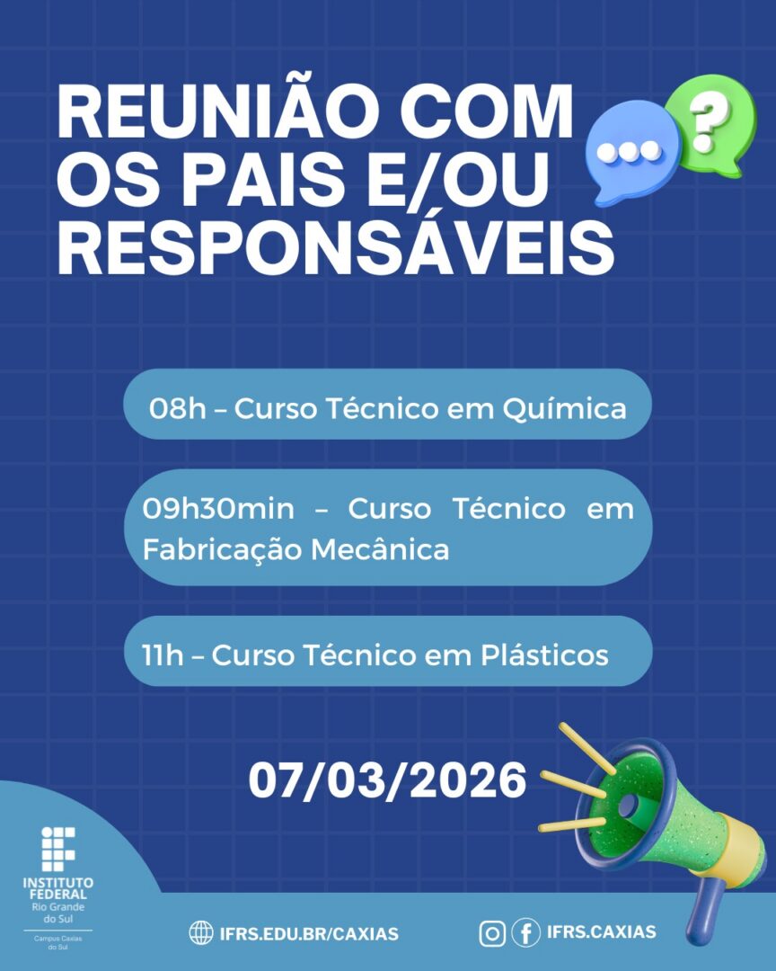 A participação da família faz toda a diferença no processo de aprendizagem. Quando escola e responsáveis caminham juntos, o estudante se sente mais seguro, motivado e preparado para aproveitar ao máximo essa nova etapa da sua formação. O IFRS – Campus Caxias do Sul reforça o convite para que todos os pais e responsáveis participem desse momento.