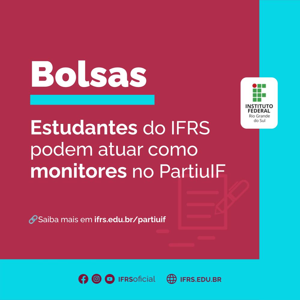 Estudantes do Instituto Federal de Educação, Ciência e Tecnologia do Rio Grande do Sul (IFRS) podem atuar como monitores do Programa Partiu IF. A seleção é voltada a estudantes de cursos técnicos, superiores de graduação ou pós-graduação matriculados a partir do 2º ano letivo ou 3º semestre. As inscrições vão até 08 de março de 2026. Todas as informações e o link para o formulário de inscrições estão no Edital da Pró-reitoria de Ensino (Proen) nº 08/2026.