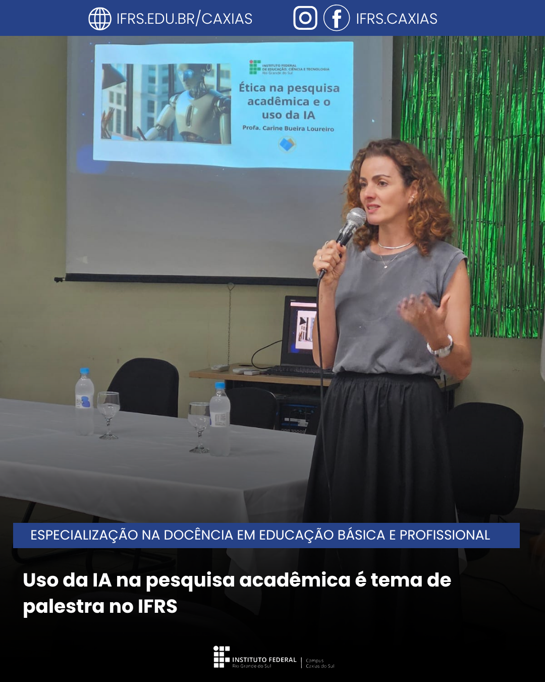 Na noite do dia 22 de abril de 2026, o curso de Especialização na Docência em Educação Básica e Profissional realizou uma palestra sobre ética na pesquisa acadêmica e o uso da inteligência artificial (IA). A atividade contou com a participação da Profª Dra. Carine Bueira Loureiro, docente permanente do Programa Profissional de Pós-graduação em Informática na Educação do Instituto Federal do Rio Grande do Sul, Campus Porto Alegre.