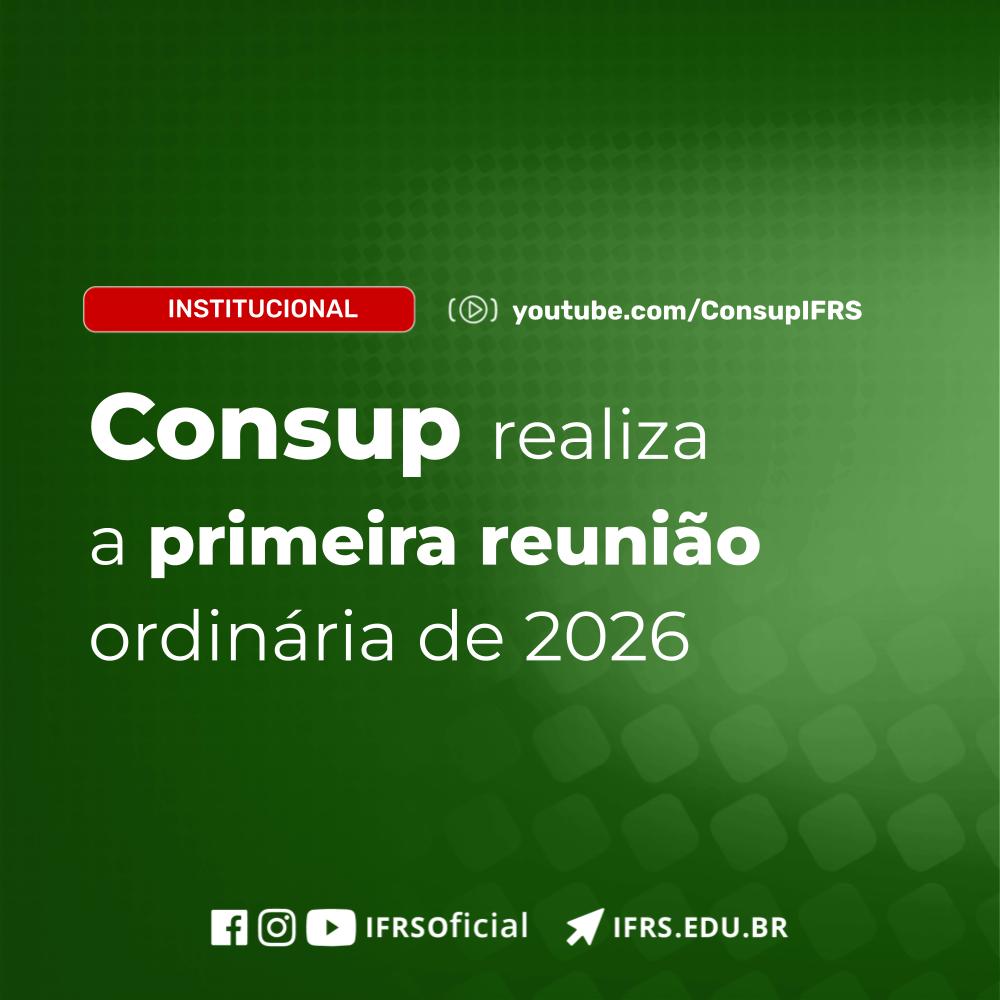 Será realizada no dia 24 de fevereiro, terça-feira, a 1ª Reunião Ordinária do Conselho Superior do IFRS em 2026. Será a partir das 09h, via webconferência, com transmissão pelo canal do Consup no YouTube.