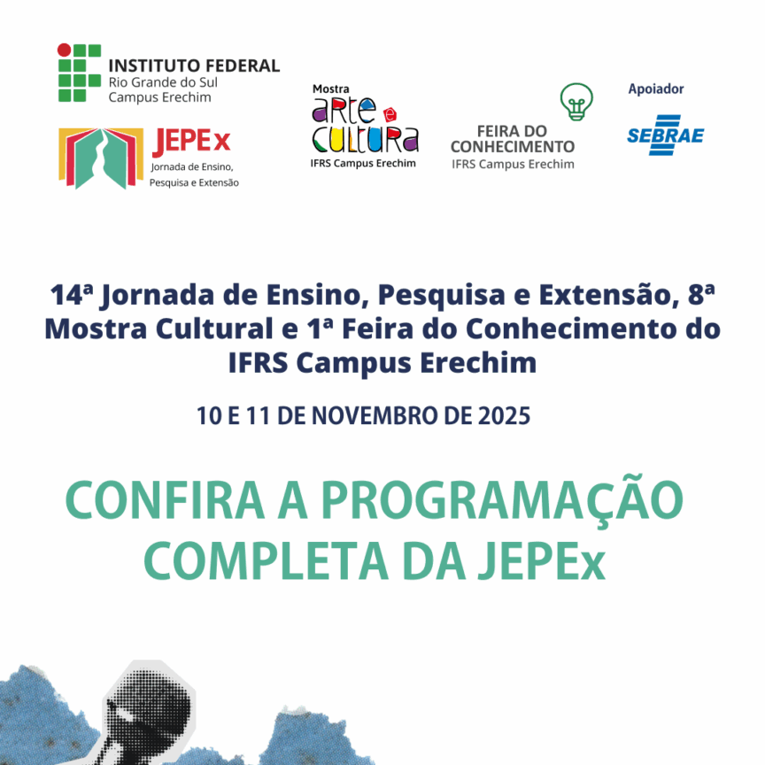 Foi divulgada nesta quarta-feira, dia 15 de outubro de 2025, a programação da 14ª Jornada de Ensino, Pesquisa e Extensão (JEPEx) do Campus Erechim do Instituto Federal do Rio Grande do Sul (IFRS). O evento ocorrerá nos dias 10 e 11 de novembro, no Instituto. A programação completa, da qual fazem parte a 8ª Mostra Cultural e a 1ª Feira…