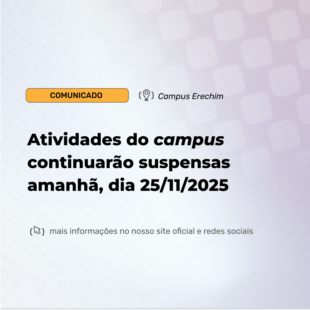 O Instituto Federal – Campus Erechim vem a público manifestar profunda solidariedade a todos(as) que foram impactados(as) pela forte tempestade de granizo que atingiu Erechim e municípios vizinhos no último domingo. Além disso, comunica que a suspensão das aulas de todos os cursos e das atividades administrativas da instituição será mantida na terça-feira, dia 25 de novembro de 2025. As…