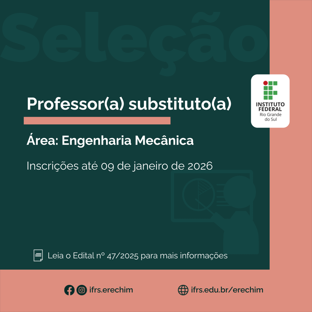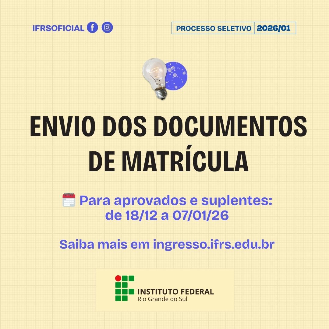 Os candidatos aprovados (classificados em primeira chamada) e também os suplentes do Processo Seletivo de Estudantes 2026/01 do Instituto Federal de Educação, Ciência e Tecnologia do Rio Grande do Sul (IFRS) – seleção por sorteio ou prova – devem enviar a documentação de matrícula até esta quarta-feira, dia 07 de janeiro de 2026. Esse envio é feito exclusivamente pelo sistema…
