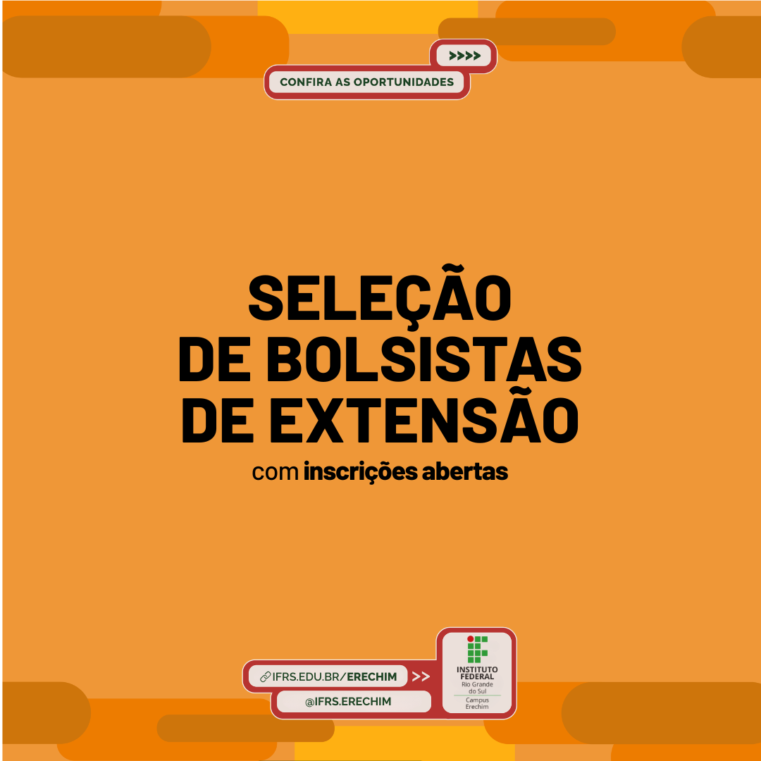Estão abertas até 18 de março as inscrições para a seleção de bolsistas de extensão do IFRS – Campus Erechim. O regulamento foi publicado no Edital nº 14/2026, disponível na aba Editais do site. Estão disponíveis 15 vagas para estudantes do campus, em 12 projetos, que variam de 08h, 12h ou 16h horas semanais, com bolsas de R$350,00, R$525,00 ou R$700,00, conforme a carga horária disponível para cada bolsista. A vigência da bolsa de extensão para cada programa ou projeto será de 07 meses, com início em 02/05/2026 e término em 30/11/2026.