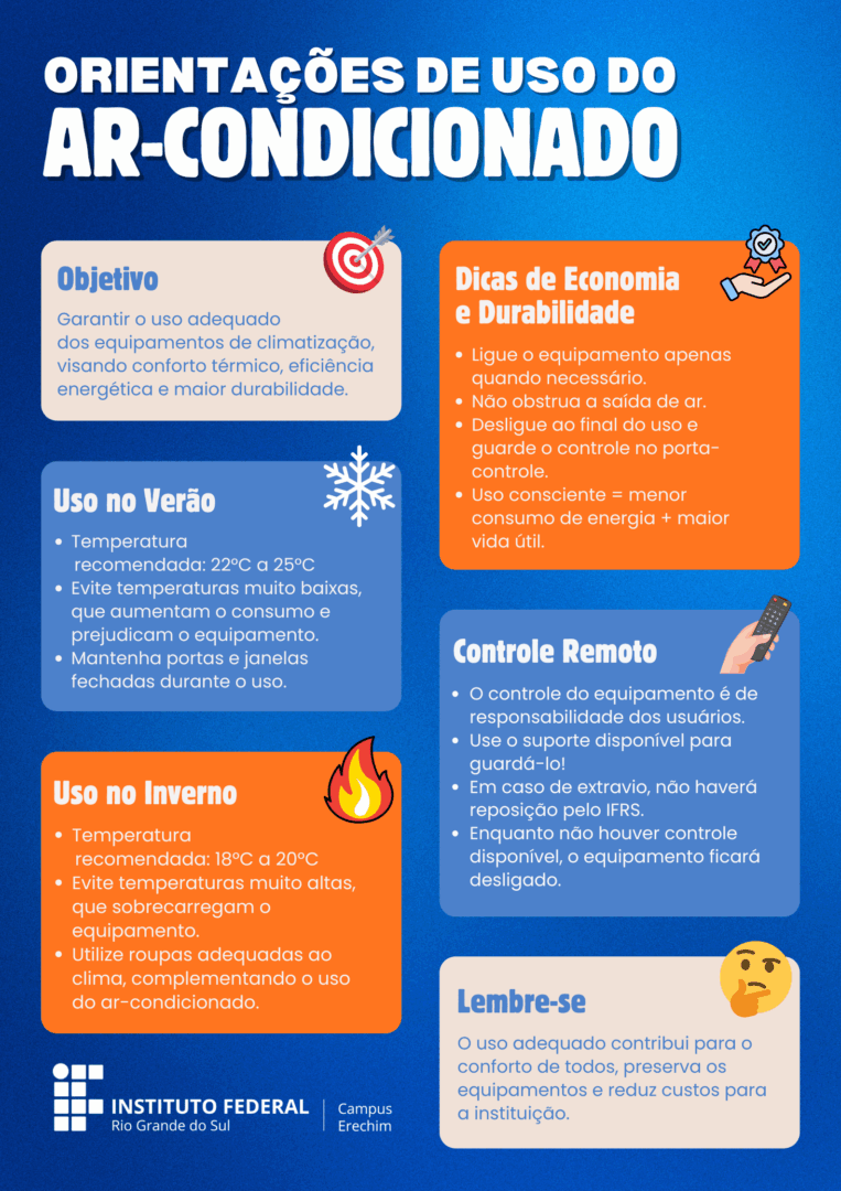 Juntamente à instalação dos equipamentos, foi elaborado um manual de orientações para uso adequado dos ares-condicionados (acesse aqui), que também será afixado em todas as salas e laboratórios, bem como compartilhado com a comunidade acadêmica. O material reforça práticas de economia de energia e de conservação dos equipamentos através da orientação sobre temperaturas recomendadas, desligamento após o uso e cuidados com os controles remotos.