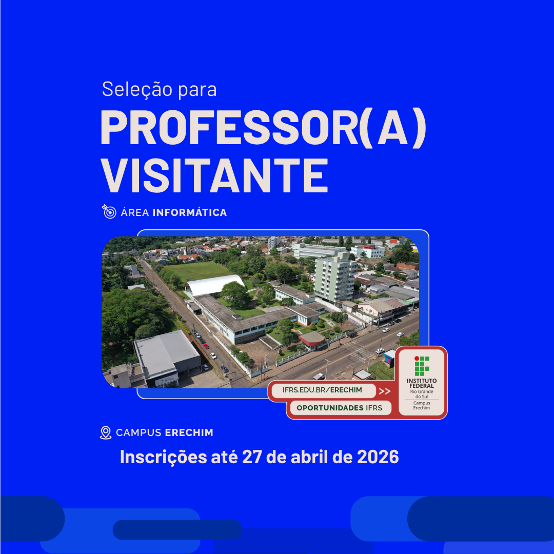 Estão abertas até 27 de abril de 2026 as inscrições para o processo seletivo simplificado para contratação de professor visitante para a área de Informática do Campus Erechim do Instituto Federal do Rio Grande do Sul (IFRS). A carga horária é de 40 (quarenta) horas semanais, e a remuneração pode alcançar R$ 14.513,12, conforme titulação. O candidato selecionado será contratado por um período de até 2 (dois) anos.
