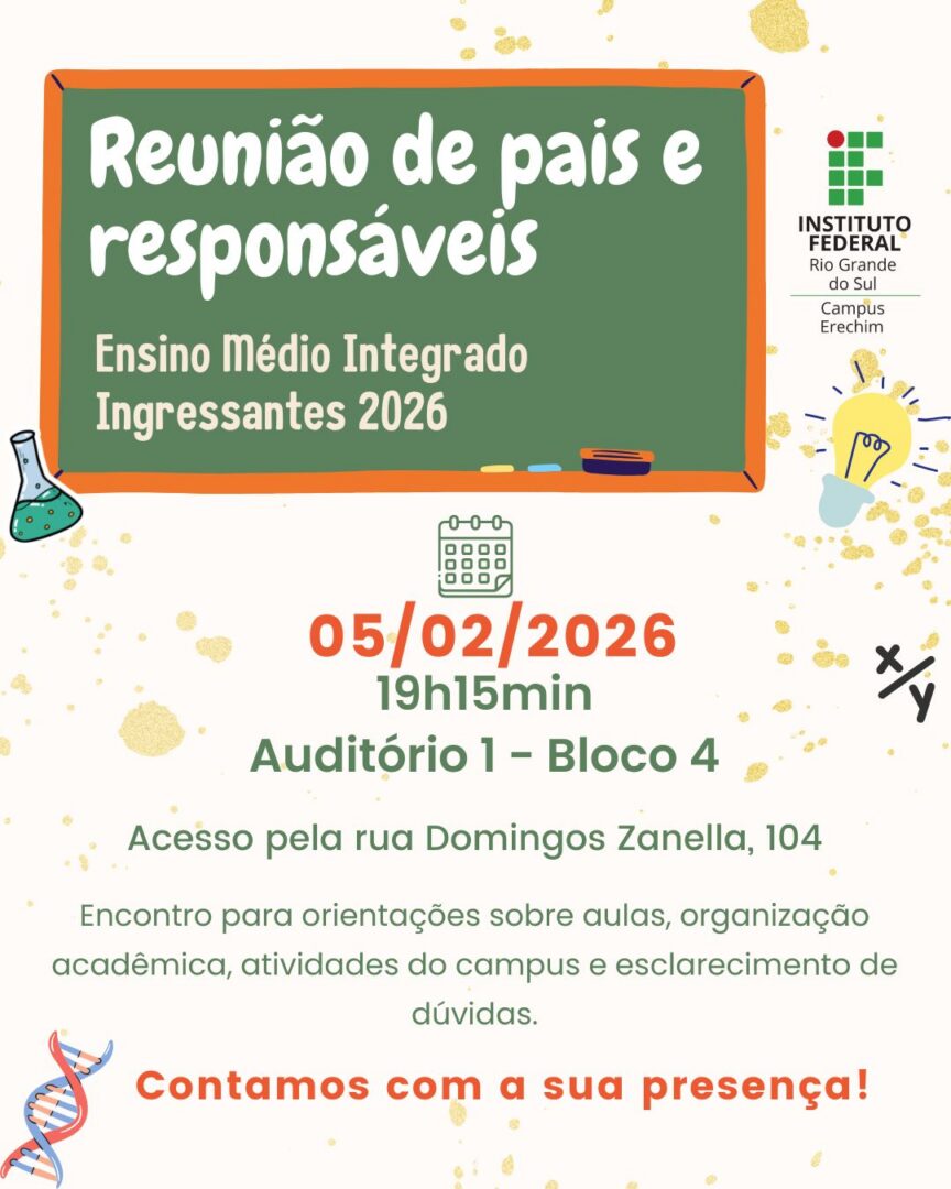 O Campus Erechim do Instituto Federal do Rio Grande do Sul (IFRS) convida pais e responsáveis dos estudantes ingressantes nos cursos técnicos integrados ao Ensino Médio em Design Gráfico, Informática, Mecatrônica e Química para uma reunião nesta quinta-feira, dia 05 de fevereiro de 2026. O encontro será realizado às 19h15 no auditório inferior do Bloco 4 (acesso pela Rua Domingos Zanella, 104. bairro Três Vendas).