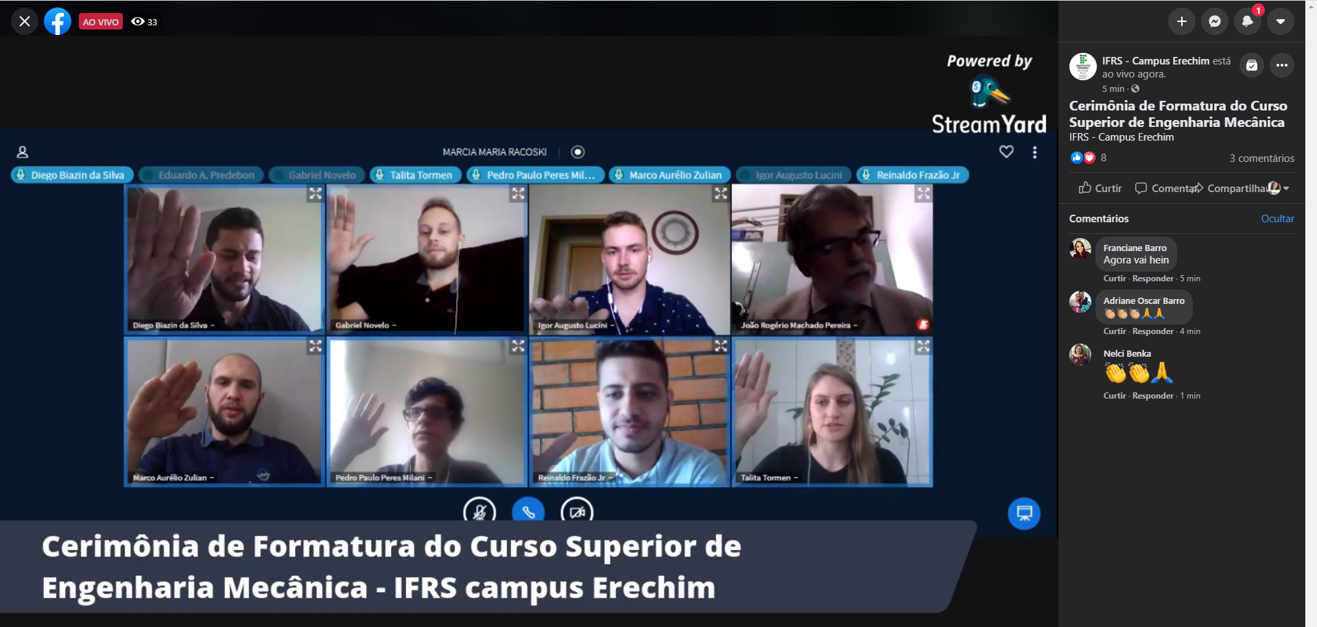 Quarta -feira, dia 09 de setembro de 2020, o Campus Erechim realizou a segunda Cerimônia de Colação de Grau por meio de webconferência da história do campus. Na ocasião oito estudantes do Curso de Bacharelado em Engenharia Mecânica, colaram grau de forma remota, representados presencialmente pelo formando e juramentista João  Vitor Benka Stormovski. Também participaram da sessão o Diretor Geral do Campus Erechim, Eduardo Angonesi Predebon, Josiele Sfredo Michelin, representante do setor Registros s e o coordenador de curso, João Rogério Machado Pereira.