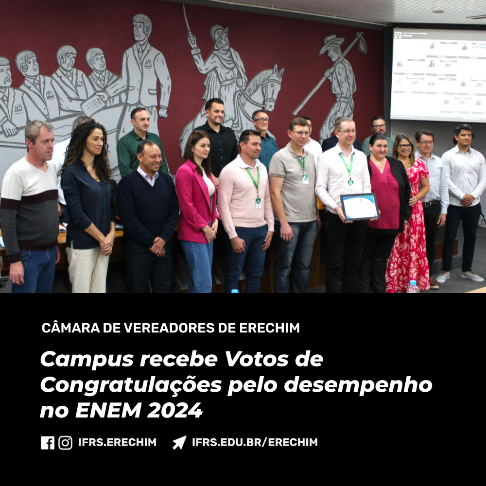 O Instituto Federal de Educação, Ciência e Tecnologia do Rio Grande do Sul (IFRS) – Campus Erechim recebeu na tarde de ontem, 21 de outubro de 2025, da Câmara de Vereadores de Erechim, Votos de Congratulações pela conquista da maior nota no Exame Nacional do Ensino Médio (ENEM) de 2024 entre os Institutos Federais da Região Sul. A indicação partiu da Vereadora Sandra Regina Picoli Ostrovski, através do requerimento legislativo nº 69/2025, e foi aprovada por unanimidade pelos demais membros da Câmara Municipal.