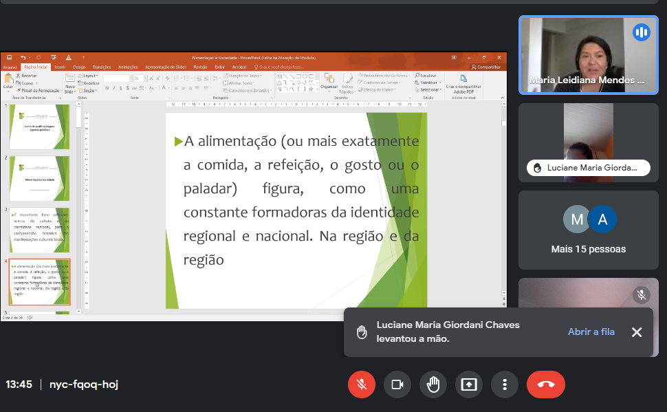 O encontro foi realizado de forma virtual, tendo em vista a participação das manipuladoras de alimentos de diferentes municípios de abrangência da 15ª Coordenadoria de Estadual Educação, e podendo desta forma facilitar o acesso e participação às trabalhadoras, sem necessidade de deslocamento como também em seus horários de trabalho. O tema abordado foi “Alimentação e Sociedade” , o qual foi ministrado pela docente Maria Leidiana Mendes de Oliveira, e acompanhamento da Coordenadora de Extensão Marlova Balke.