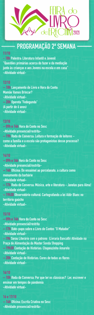 CONFIRA A PROGRAMAÇÃO DA SEGUNDA SEMANA DA FEIRA DO LIVRO 2021
