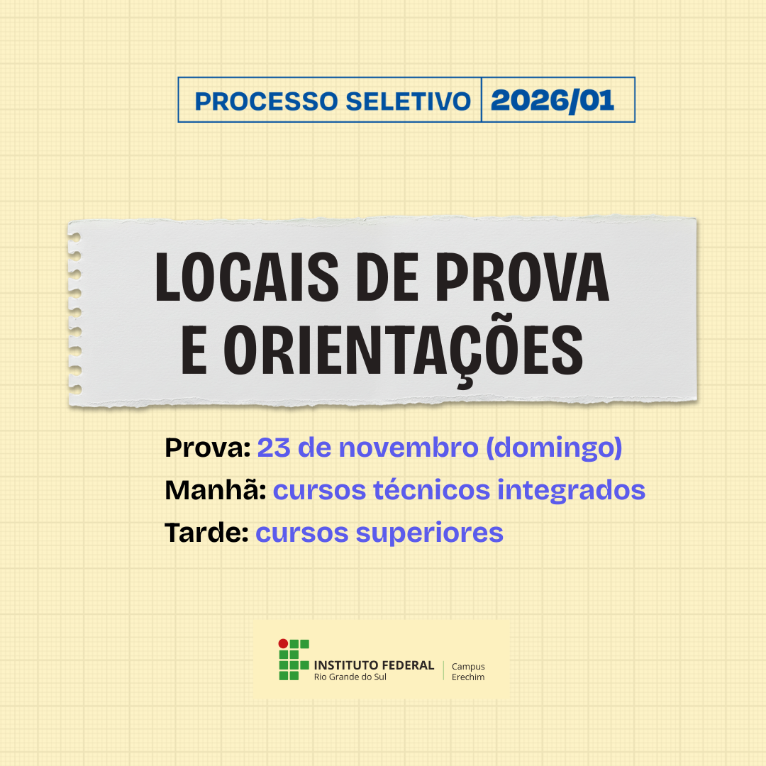 Os locais de realização das provas do Processo Seletivo de Estudantes 2026/01 do Instituto Federal de Educação, Ciência e Tecnologia do Rio Grande do Sul (IFRS) estão disponíveis no site ingresso.ifrs.edu.br. Os candidatos devem verificar atentamente o local, endereço e demais informações sobre o exame e manter esses dados consigo até o dia da prova.