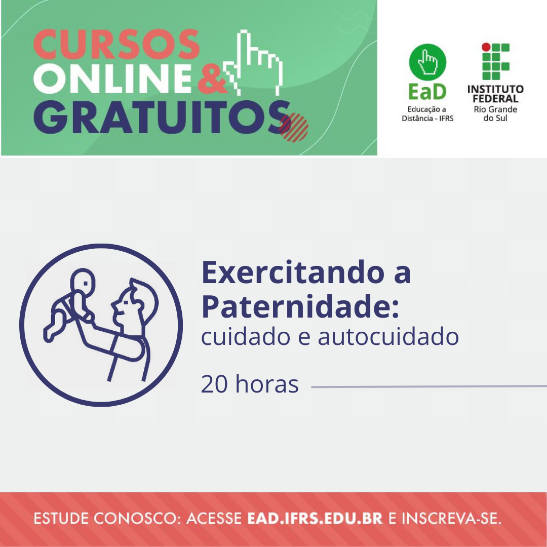 O Instituto Federal do Rio Grande do Sul está com inscrições abertas para o curso on-line e gratuito “Exercitando a Paternidade: cuidado e autocuidado” . As inscrições devem ser realizadas pelo Moodle do IFRS. A carga horária do curso é de 20h.