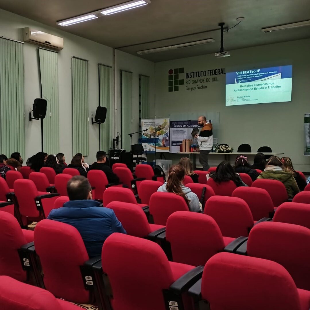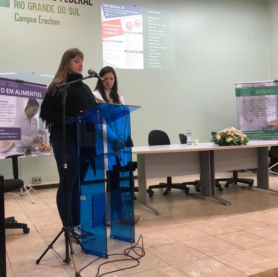 Entre os dias 26 e 28 de junho, foram realizadas a VIII Semana Acadêmica de Engenharia de Alimentos e a VIII Semana Técnica de Alimentos (VIII SeATec) do Campus Erechim do IFRS. O evento contou com uma programação variada, contemplando palestras, visitas técnicas e oficinas. No dia 26, após a cerimônia de abertura, ocorreram duas palestras: “Vigilância Sanitária – Atuação e Legislação”, com a nutricionista Naiara Nava Rigo, especialista em Saúde Nutricional da 11ª Coordenadoria Regional de Saúde de Erechim, e “Introdução ao Mundo das bebidas”, com Valmor Bandiera, enólogo da Cervejaria Ágape.