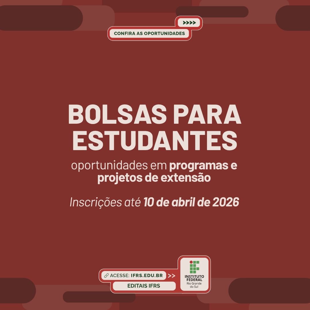 Estudantes do Instituto Federal de Educação, Ciência e Tecnologia do Rio Grande do Sul (IFRS) podem se inscrever, até 10 de abril de 2026, para vagas de bolsistas em programas e projetos de extensão. São ofertadas sete vagas, com carga horária entre 8 e 16 horas semanais, em atividades remotas, conforme o Edital da Pró-Reitoria de Extensão (Proex) nº 09/2026.