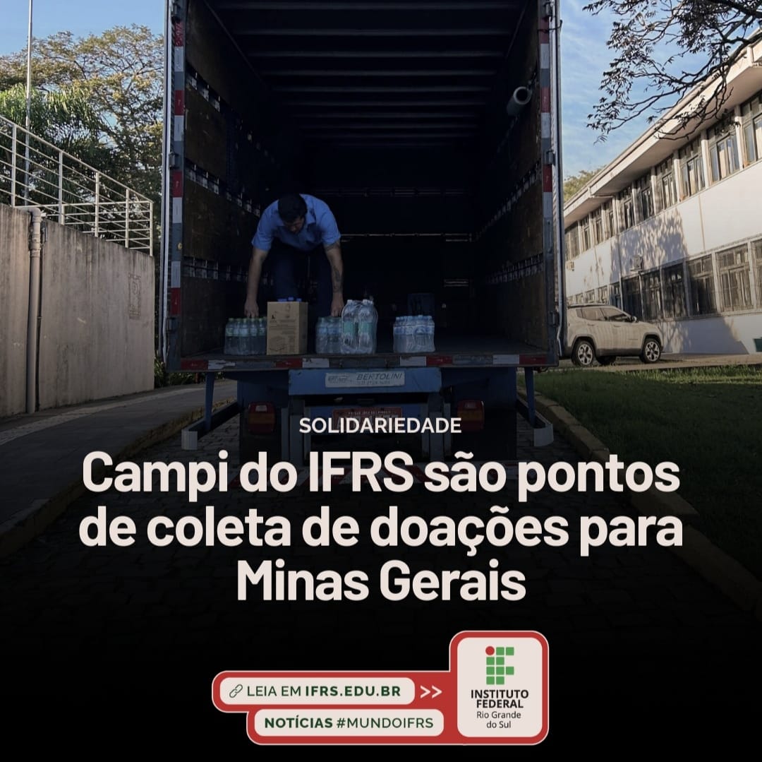Para ajudar as pessoas atingidas pelas fortes chuvas em Minas Gerais, o Instituto Federal de Educação, Ciência e Tecnologia do Rio Grande do Sul (IFRS) convida estudantes, servidores e a comunidade externa a se engajar em uma campanha de arrecadação de produtos de limpeza e itens de higiene pessoal. Todas as unidades do IFRS são pontos de coleta para as doações.