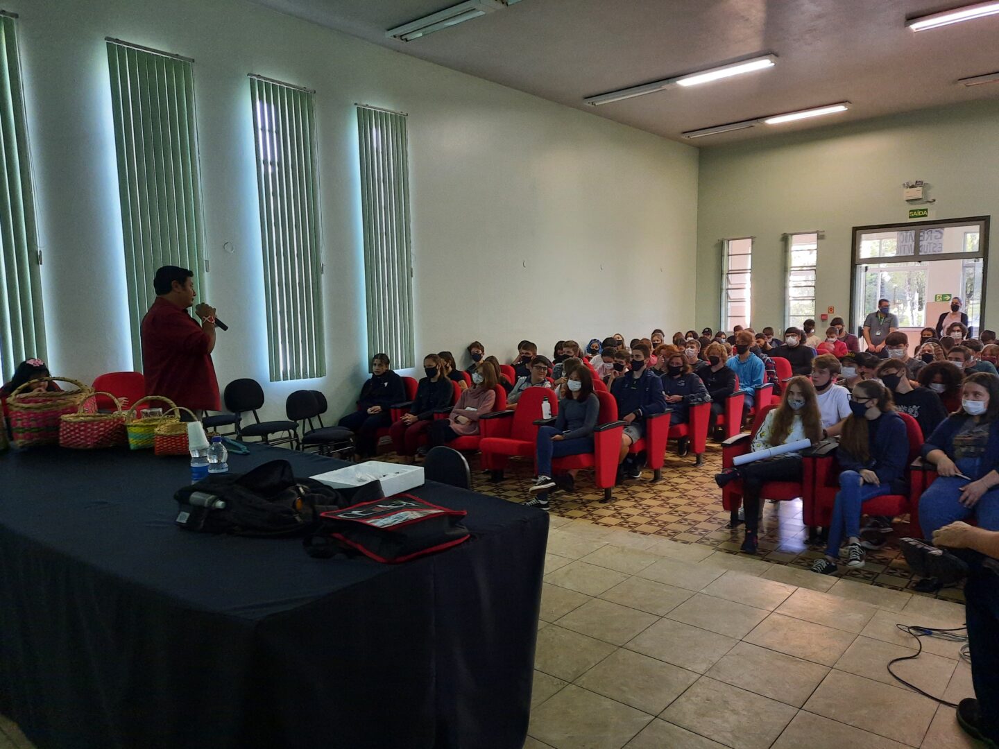 Na última quarta-feira, dia 27 de abril, as turmas do Ensino Médio Integrado dos cursos de Informática e Mecatrônica do IFRS – Campus Erechim, participaram de uma atividade organizada em alusão à Semana dos Povos Indígenas, a qual oportunizou a interação dos estudantes com a temática, por meio de diálogo com Joel Kuaray, Cacique Guarany da comunidade de Mato Preto de Erebango, que também é professor da rede estadual e acadêmico da Universidade Federal da Fronteira Sul – UFFS.