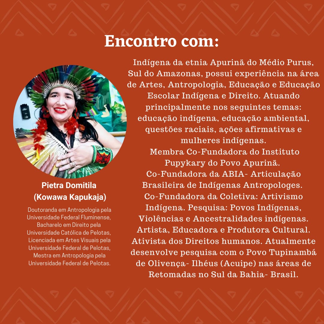 Pietra Dolamita (Kowawa Kapukaja) é Doutoranda em Antropologia pela Universidade Federal Fluminense / Sorbonne Nouvelle Paris 3, Mestra em Antropologia pela Universidade Federal de Pelotas (2018), Bacharel em Direito pela Universidade Católica de Pelotas (2004), e Licenciada em Artes Visuais pela Universidade Federal de Pelotas (2020). Tem experiência na área de Artes, Antropologia, Educação e Educação Escolar Indígena e Direito, tendo como suas principais áreas de atuação: educação indígena, educação ambiental, questões raciais, ações afirmativas e mulheres indígenas.