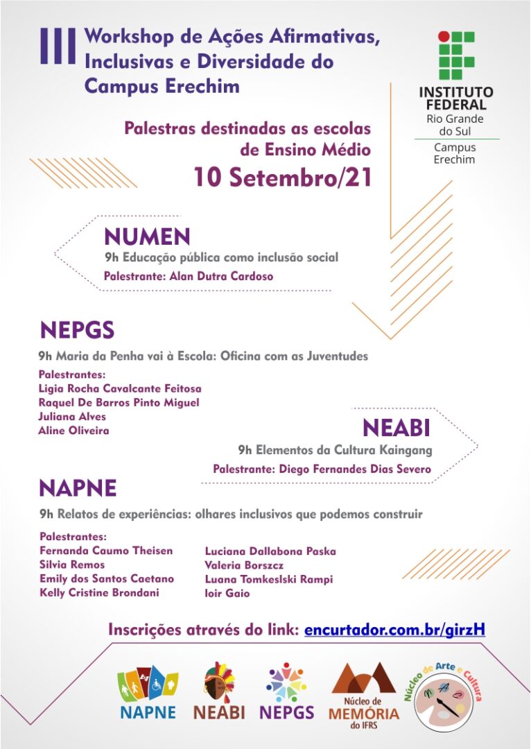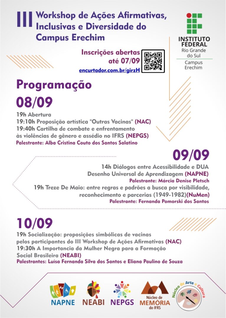 O III Workshop de Ações Afirmativas, Inclusivas e Diversidade do IFRS Campus Erechim será um evento online e está sendo organizado pela Coordenação de Extensão e os núcleos do IFRS: NAPNE – Núcleos de Atendimento às Pessoas com Necessidades Educacionais Específicas, NEABI – Núcleo de Estudos Afro-Brasileiros e Indígenas, NEPGS – Núcleo de Estudos e Pesquisas em Gênero e Sexualidades, NUMEN – Núcleo de Memória e Núcleo de Arte e Cultura, com a proposta visa integrar os núcleos de Ações Afirmativas do IFRS Campus Erechim.