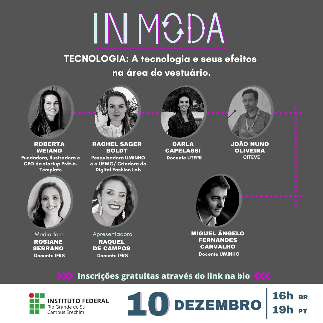 10/12/20 – TECNOLOGIA: A tecnologia e seus efeitos na área do vestuário, com os seguintes palestrantes: Roberta Weind (Fundadora, ilustradora e CEO da startup Prêt-à-Template, Rachel Sager Boldt (Pesquisadora da UMINHO e UEMG/ Criadora do Digital Fashion Lab), Miguel Carvalho (Docente da UMINHO), Carla Capelassi (Docente da UTFPR), João Nuno Oliveira (CITEVE- Portugal) a mediação será realizada pela docente do IFRS Rosiane Serrano e a mestre de cerimônia Raquel de Campos, também docente do IFRS.