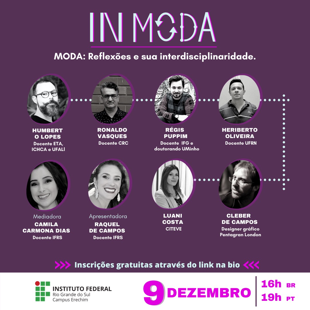 09/12/20 – MODA: Reflexões e sua interdisciplinaridade, com os seguintes palestrantes: Humberto Lopes (Docente da ETA, ICHCA e UFAL), Ronaldo Vasques (Docente do CRC), Régis Puppim (Docente do IFG e doutorando da UMINHO- Portugal), Heriberto Oliveira (Docente da UFRN), Cleber Rafael de Campos (Designer gráfico da Pentagran London) e Luani Costa (CITEVE- Portugal) a mediação será realizada pela docente do IFRS Camila Carmona Dias e a mestre de cerimônia Raquel de Campos, também docente do IFRS.