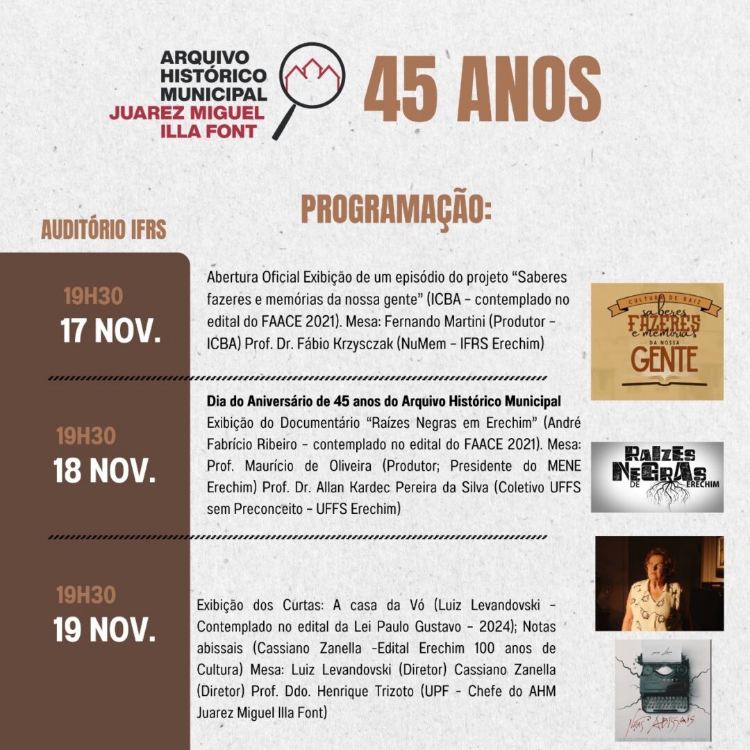 Entre os dias 17 e 19 de novembro de 2025, a I Mostra de Cinema do Arquivo Histórico Municipal Juarez Miguel Illa Font celebra o aniversário de 45 anos do Arquivo, comemorado no dia 18 de novembro. O evento é realizado em parceria com o Núcleo de Memória (NuMem) do Campus Erechim do Instituto Federal do Rio Grande do Sul (IFRS) e tem como objetivo valorizar produções de artistas locais. A entrada é gratuita e haverá certificação aos presentes.
